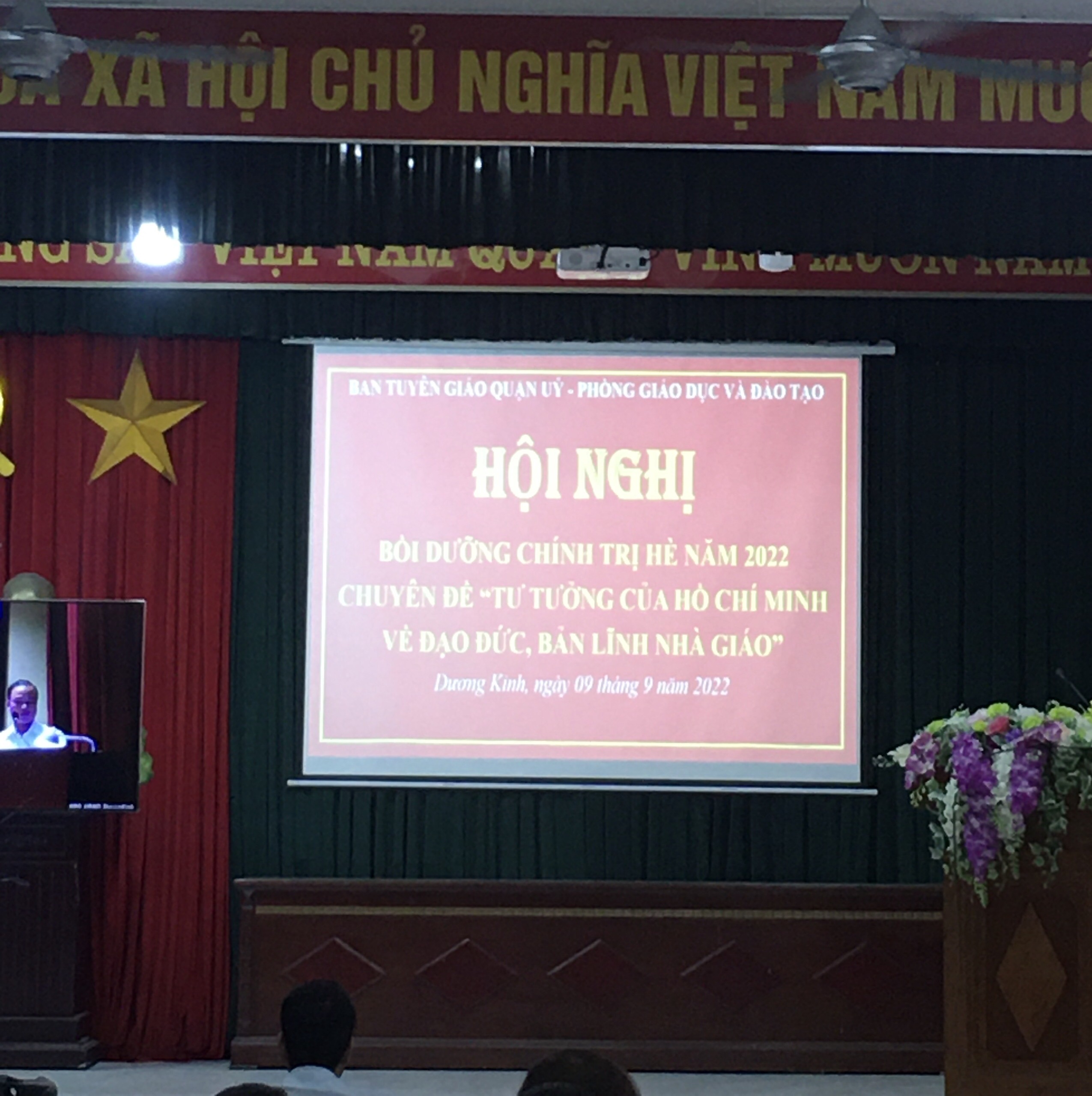 Sáng ngày 09/9/2022 tại Hội trường trung tâm hành chính quận, Ban Tuyên giáo Quận uỷ phối hợp với Phòng GD&ĐT quận tổ chức Hội nghị Bồi dưỡng chính trị hè năm 2022 Chuyên đề “Tư tưởng Hồ Chí Minh về đạo đức, Bản lĩnh nhà giáo”. Tới dự và chỉ đạo có Đồng chí Giáo sư, Tiến sĩ Hoàng Chí Bảo, chuyên gia cao cấp, nguyên Ủy viên Hội đồng lý luận Trung ương (trực tiếp giảng), đồng chí Đào Văn Ninh - TUV, Bí thư Quận uỷ, các đồng chí Thường trực QU, HĐND, UBND, UBMTTQ Việt Nam quận, các đồng chí Uỷ viên BTV Quận uỷ, lãnh đạo các phòng, ban, ngành đoàn thể quận và đội ngũ giáo viên toàn quận. Hội nghị diễn ra theo hình thức trực tiếp tại điểm cầu trung tâm : Hội trường trung tâm hành chính quận và trực tuyến xuống điểm cầu các phường: Đa Phúc, Hoà Nghĩa, Tân Thành.