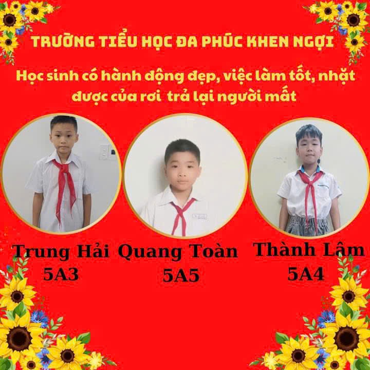 Vào ngày 29/8/2024, các em đã nhặt một chiếc ví rơi trên đường. Thay vì giữ lại cho riêng mình, các em đã giao lại cho công an phường Đa Phúc với mong muốn trả lại cho người mất. Sự trung thực và tinh thần trách nhiệm của em đã giúp cô Hoàng Thị Hằng (Người mất ví) nhận lại tài sản quý giá của mình, và điều đó thực sự rất đáng trân trọng.